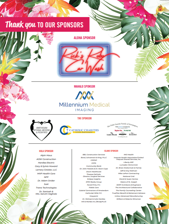 On August 14, 450 people (record attendance!) came together at the historic Sanford Stud Farm on Rt. 30 in Amsterdam to show their support of St. Mary’s. Thanks to the efforts of so many — sponsors, donors, volunteers, guests, and vendors — the gala raised more than $100,000 in support of St. Mary’s urgent care and emergency services. It was a celebratory, memorable evening full of aloha spirit and community. On behalf of the Foundation and Auxiliary, thank you for your generosity and support of St. Mary’s!